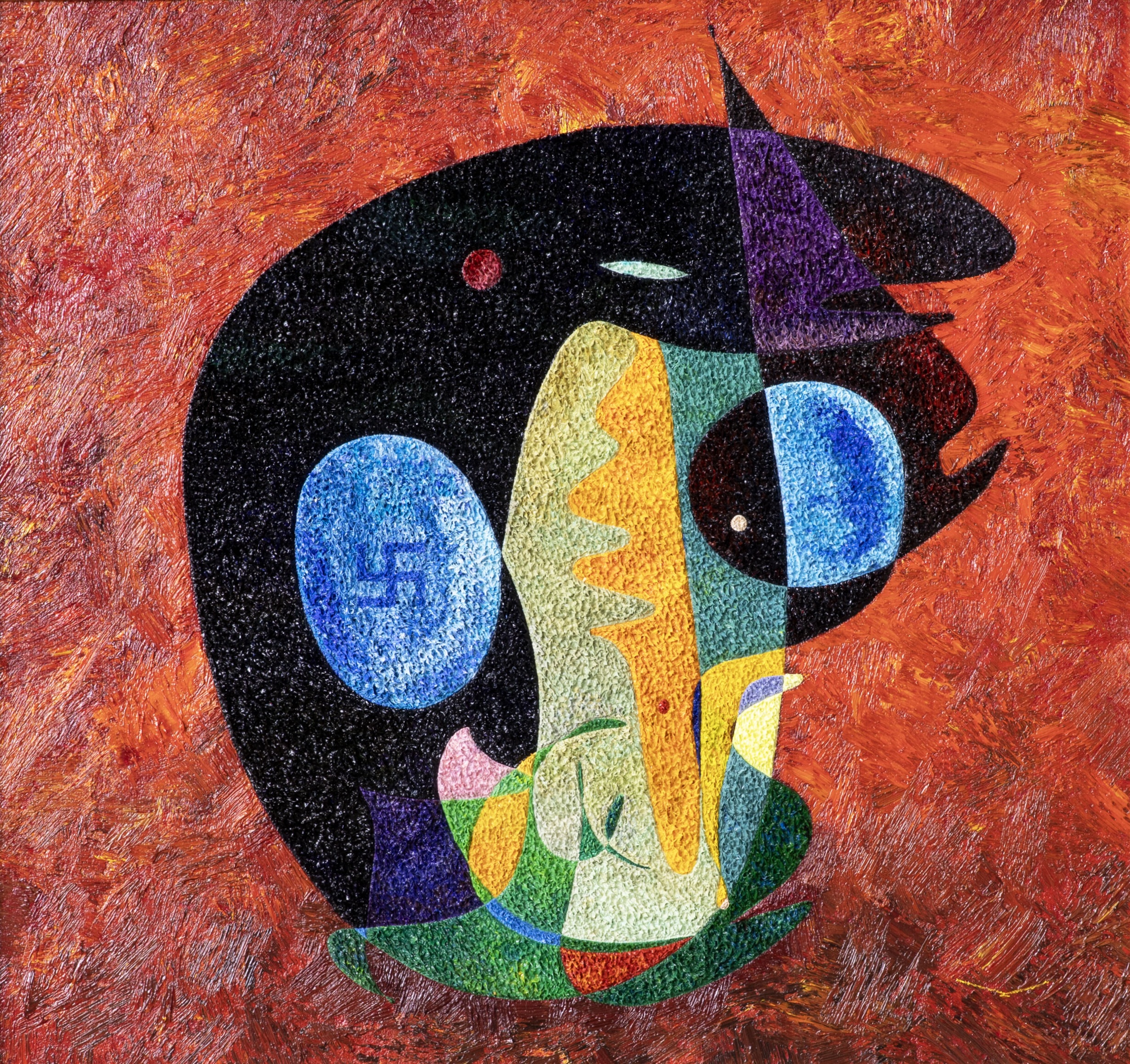 中央形体被划分为对比鲜明的区域。一侧由浓重的黑色块面主导,形成暗示不透明性与控制力的视觉重量;另一侧则由黄色、蓝色与绿色的碎片化色面构成,引入断裂与多重性。这种不对称的平衡阻止了视觉上的统一,强化了内在张力。